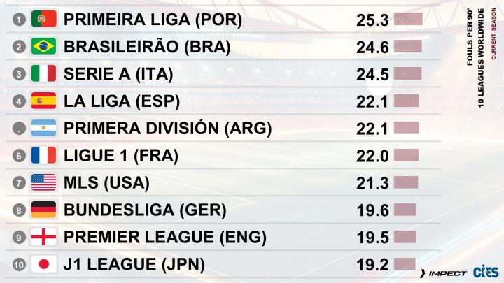 当地时间10月13号,瑞士足球天文台统计了各个国家联赛每90分钟的犯规情况,葡超以25.3次犯规稳坐头把交椅,巴甲24.6次排第二,意甲24.5次第三。